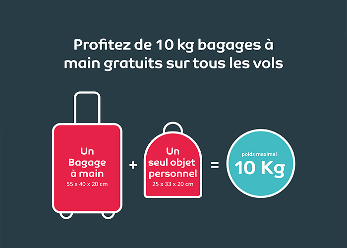 Tous nos types de tarifs incluent un bagage cabine gratuit, sous réserve des restrictions suivantes concernant le poids, les dimensions et le nombre de pièces :